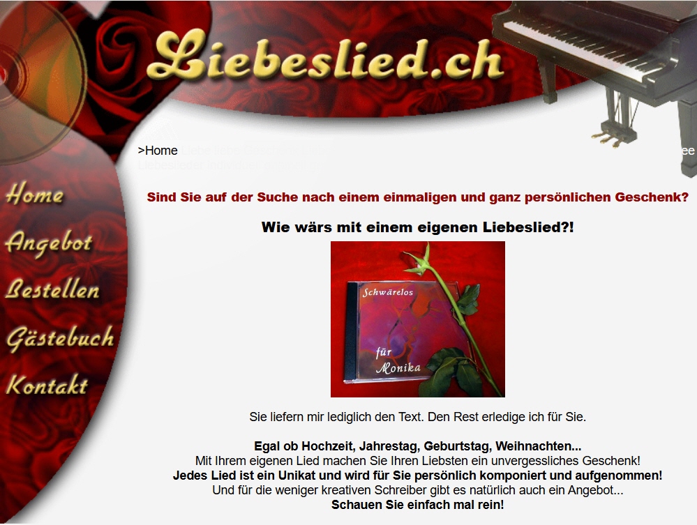 2002 gründe ich meinen ersten Online-Shop Liebeslied.ch und mache persönliche Lieder für allerlei Anlässe, vor allem aber Liebeslieder. Das Highlight war eine Einladung in Lea Hadorns Live-Show "Haushaltrevue", bei der ich eine witzige Liebesliedversion für Stargast Stefan Gubser vortragen konnte.