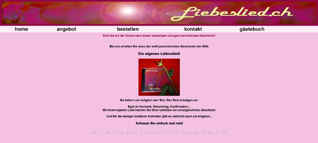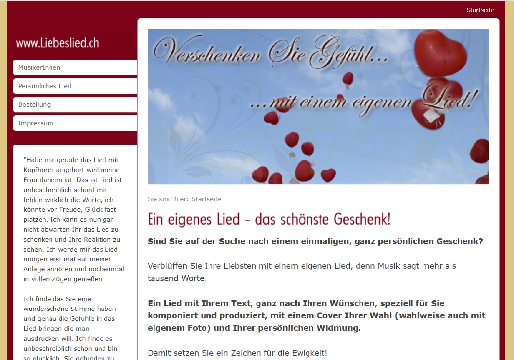 2002 gründe ich meinen ersten Online-Shop Liebeslied.ch und mache persönliche Lieder für allerlei Anlässe, vor allem aber Liebeslieder. Das Highlight war eine Einladung in Lea Hadorns Live-Show "Haushaltrevue", bei der ich eine witzige Liebesliedversion für Stargast Stefan Gubser vortragen konnte.
